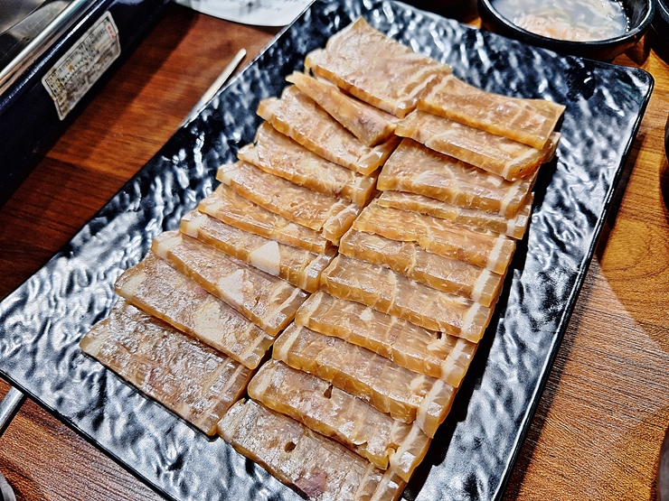 서비스로 받은 편육. 편육은 흔히 볼 수 있는 그런 모습이다. 이런 서비스는 없어도 되지만 제공을 받으면 괜히 기분이 좋아지고 소주 한 병을 더 마시게 되는 기회가 되기 마련이다. 편육의 맛은 앞서 나온 요리에 비해 특별한 것은 없었지만 그래도 기분 좋게 먹었다.