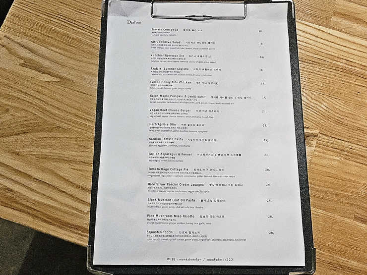 메뉴. 일반적인 비건 요리는 아니고 나 같은 육식주의자도 쉽게 먹을 수 있는 구성으로 되어 있다. 예전에는 콩으로 만든 저급한 콩고기가 비건 요리의 전부였지만 이제는 비건 요리도 상당한 수준에 올라온 것이 사실이다. 이왕 방문한 거 최대한 많은 요리를 다양하게 즐기기로 결정했다. 역시 중용의 미덕을 잘 지키는 멋진 나.