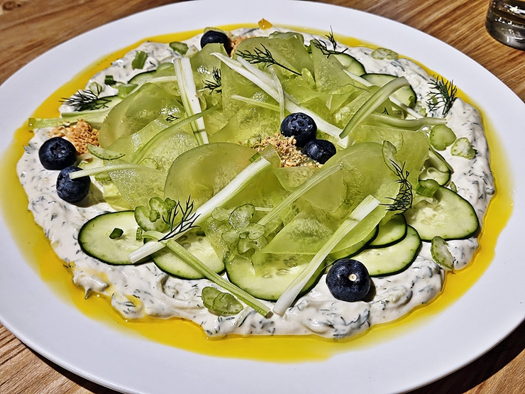 치자키 여름 채소 세비체. 오이, 블루베리, 어쩌고와 저쩌고를 사용해서 만든 세비체다. 함께 제공되는 사워도우 브레드와 함께 먹어도 좋고 그냥 떠먹어도 좋다.