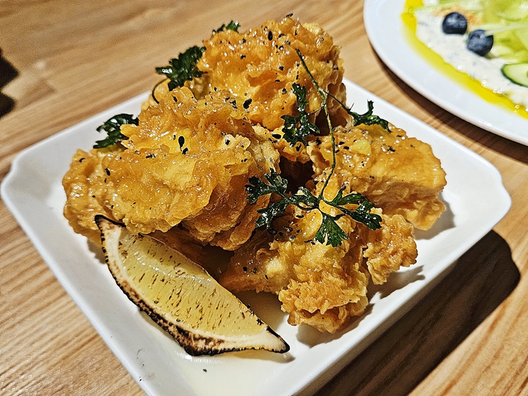 레몬 허니 두부 치킨. 두부의 수분을 제거한 후 튀김 옷을 입혀 치킨처럼 튀겨냈다. 거기에 꿀과 레몬을 사용해서 만든 소스를 끼얹었다. 치킨과 식감은 다르지만 튀김 옷이 있어서 그런지 바삭한 식감은 잘 살려냈다. 개인적으로 단 맛과 신 맛을 좋아하지 않아서 많이 먹지는 못했다.