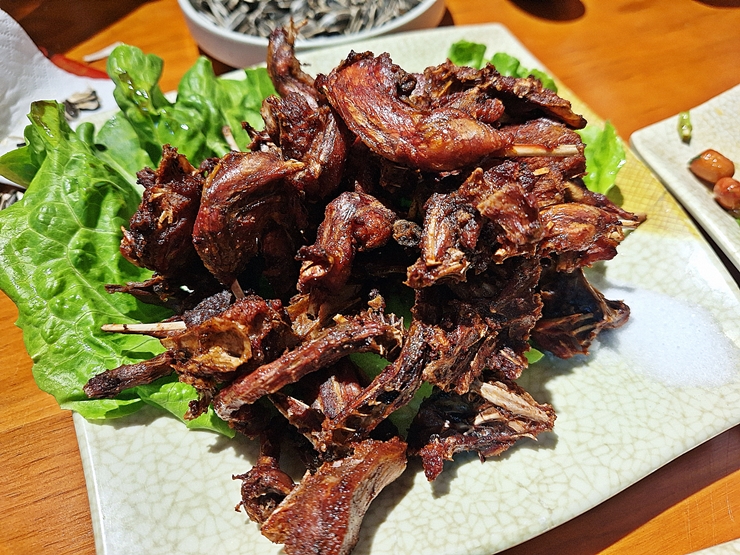 메추라기 튀김. 메추라기는 닭에 비해 작고 먹을 것이 많이 없다. 메추라기를 엄청 바삭하게 튀겨서 뼈까지 씹어 먹을 수 있게 했다. 함께 나오는 소금에 찍어 먹으면 되는데 워낙 바삭하게 튀겨서 그런지 고소한 맛이 진했다. 대신 고기가 그만큼 질기게 느껴졌다.