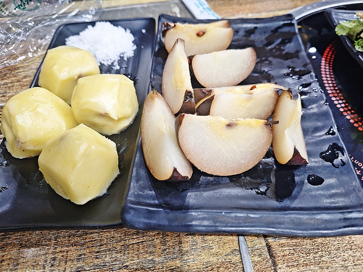 후식으로 주문한 떡과 과일. 떡은 그냥 떡이었고, 과일도 그냥 과일이었다. 내 입에는 둘 다 잘 맞지 않아 하나만 먹었지. 이날도 여지없이 배부르게 잘 먹었다. 이우시 강남4구에서 저렴하면서도 맛있는 꼬치 요리를 먹고 싶다면 한 번 가볼 것을 추천하는 곳이다.