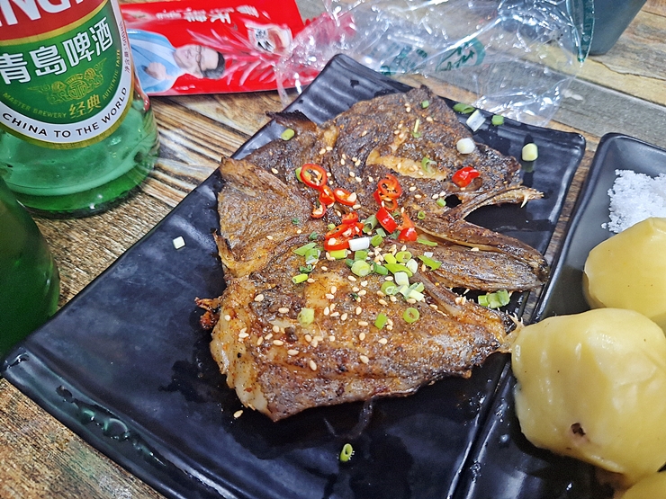 어쩌고 생선 대가리 구이. 무슨 생선이라고 했는데 생선 이름이 기억 나지 않는다. 생선 대가리를 바삭하게 굽고 조금 매운 양념을 끼얹었다. 호쾌하게 손으로 잡고 뜯고 싶었지만 난 노쇠하고 치아가 약하기 때문에 젓가락을 사용해서 먹었다. 짭짤한 맛이 제대로 술 안주였다.