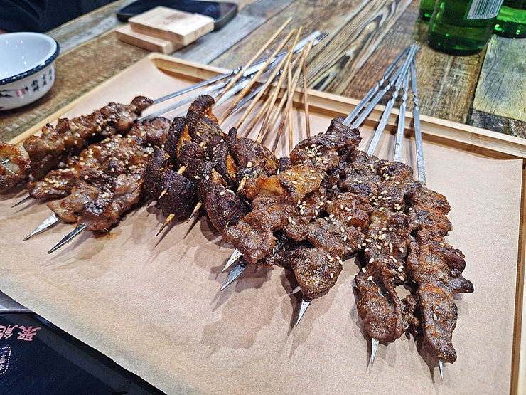 다양한 꼬치 요리들. 이 꼬치 하나가 50전이다. 한국 돈으로 따지면 약 100원 수준이다. 참으로 저렴한 가격이 아닐 수 없다. 양고기, 버섯, 닭 염통을 주문했는데 하나 같이 맛이 다 좋았다. 조금 자극적이긴 했지만 술을 마실 때는 자극적인 맛이 더 땡기는 법이지.