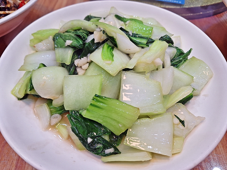 청경채 볶음. 중국에서 가장 많이 먹는 채소를 꼽으라고 한다면 청경채일 것이다. 무협 영화를 보면 이런 청경채 요리가 꼭 하나는 나온다. 마치 내가 영호충이 된 것 같은 생각을 하며 청경채 볶음을 먹고 양매 담금주를 또 마셨지.