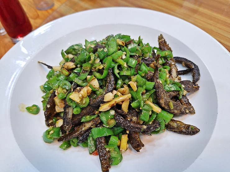 미꾸라지 튀김. 미꾸라지를 한 번 튀긴 후 엄청나게 많은 고추와 마늘을 넣고 볶았다. 미꾸라지는 한국에서도 많이 먹기에 아주 맛있게 잘 먹었지. 미꾸라지 특유의 흙냄새를 잘 없애고 짭짤하게 튀기고 볶았다. 함께 들어 있는 고추가 내 입에는 상당히 매워서 고추는 살살 빼고 마늘과 미꾸라지만 공략했다.