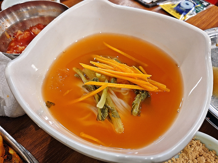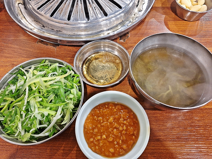 파무침, 소금, 쌈장과 된장국을 제공한다. 갈매기살은 그냥 먹어도 맛있지만 이런 양념과 함께 먹으면 더욱 맛있게 먹을 수 있다. 된장국이 굉장히 구수하고 진해서 한 번 리필을 했다. 이 된장국 하나로도 고기가 익기 전에 소주 한 병은 거뜬하다. 그래서 이날도 여지 없이 취했다.