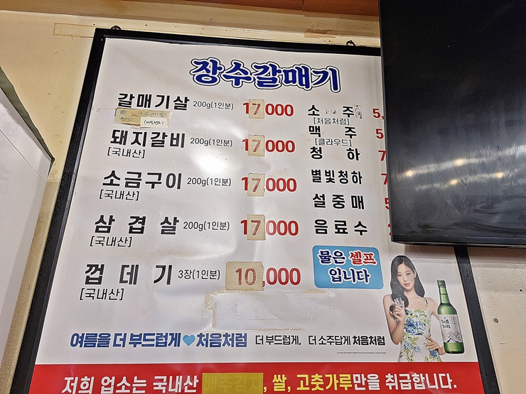 메뉴. 갈매기살, 돼지갈비, 소금구이, 삼겹살, 껍데기와 열무 국수를 판매하고 있다. 다양한 고기를 판매하지만 압도적으로 갈매기살이 많이 팔린다. 우리는 갈매기살과 껍데기를 주문했다. 난 껍데기를 굉장히 좋아하기 때문에 껍데기를 단독 메뉴로 파는 곳에서는 꼭 주문을 하는 편이다.