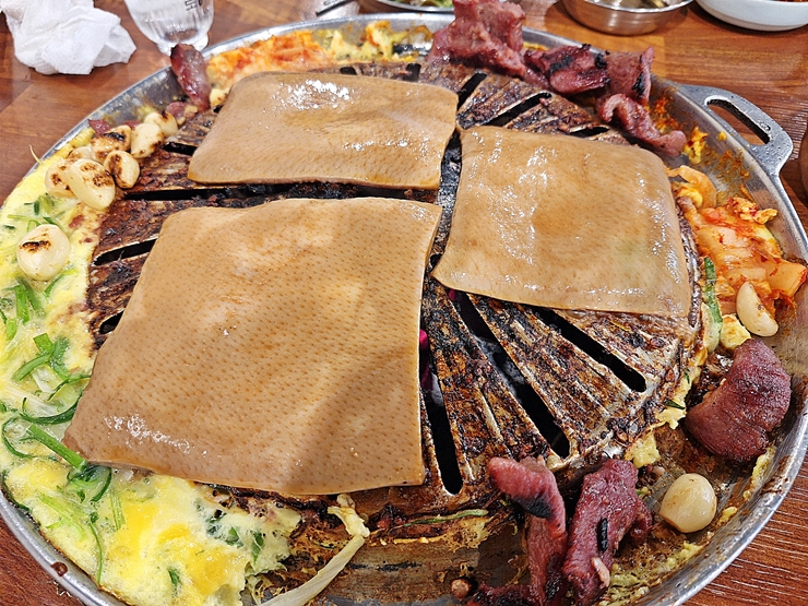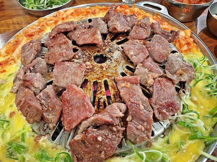 갈매기살을 다소곳하게 불판 위에 올렸다. 불판에 계란 물을 풀어 주는데 이 계란 물에 파나 김치를 넣어 먹으면 좋다. 예전에는 계속 리필을 해줬는데 이제 물가가 많이 올라서 리필을 계속 해주지 않는 것 같다. 우리는 고기에 집중을 했기 때문에 따로 리필을 하지 않았다.