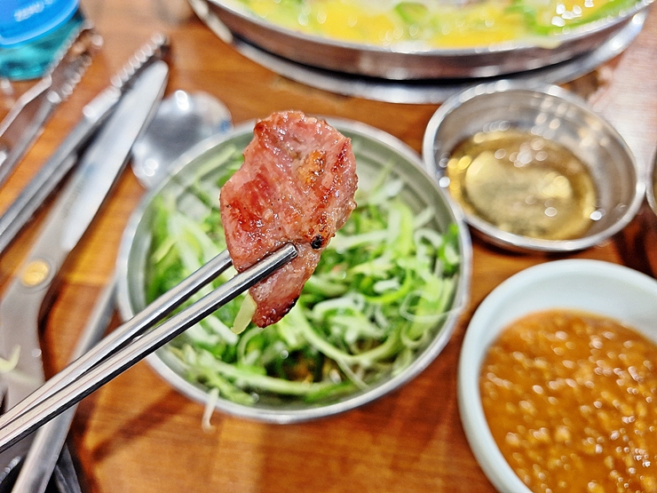 계속해서 고기만 먹고 싶었지만 짝꿍이 채소를 많이 먹으라는 말을 해서 이렇게 쌈 채소와도 함께 먹었다. 어떤 양념과 먹어도 잘 어울린다. 하지만 내 입에는 역시 그냥 고기만 먹는 것이 가장 좋다. 고기를 먹을 때는 온전하게 고기에 집중을 해야 한다. 그것이 진정한 육식주의자라고 할 수 있다.
