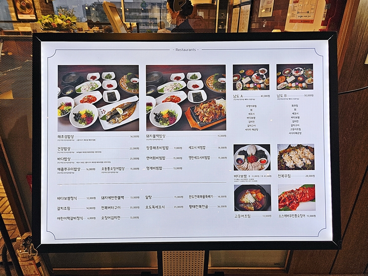 메뉴. 해초섬 밥상을 메인 메뉴로 내세우고 있고, 돼지 불백 밥상도 있다. 그 밖에 바다보쌈, 전복무침, 고등어 조림, 갈치 조림과 황태 전복 전골 등 다양한 요리를 판매하고 있다. 메뉴 선택은 같이 간 동료에게 맡긴 후 난 조용히 고기를 탐하기로 했지. 해산물도 좋지만 역시 고기가 더 좋다.