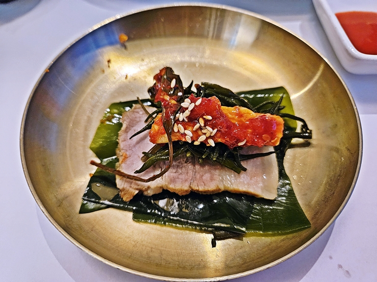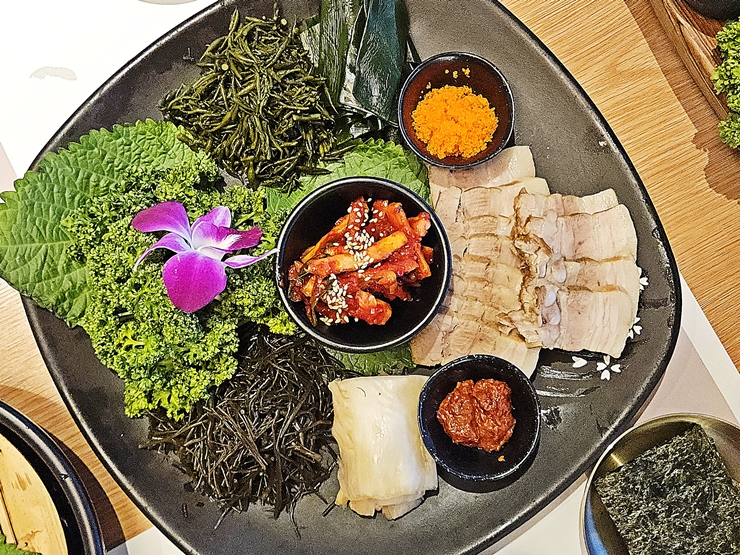 바다 보쌈. 아아, 역시 고기 사진이 있어야 포스팅할 맛이 난다. 고기가 없는 세상은 대체 어떤 세상일까. 바다 보쌈은 삼겹살로 만든 수육, 다양한 해초와 날치 알 등이 함께 나온다. 김에 해초를 올린 후 수육을 올려 보쌈처럼 먹으면 된다고 한다.