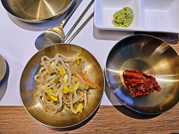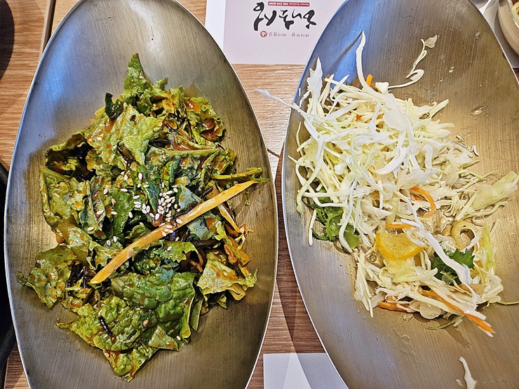 반찬. 콩나물, 무말랭이, 겉절이와 샐러드 등이 나온다. 참으로 건강하기 그지 없는 반찬의 구성이 아닐 수 없다. 나처럼 고기를 많이 먹는 사람은 이렇게 틈틈이 고기를 섭취해야 한다. 그렇지 않으면 고지혈증이 걸릴 위험이 있다고 한다. 난 건강을 끔찍하게 생각하기 때문에 채소를 조금씩 꾸준히 섭취했다. 역시 건강꾸러기인 멋진 나.