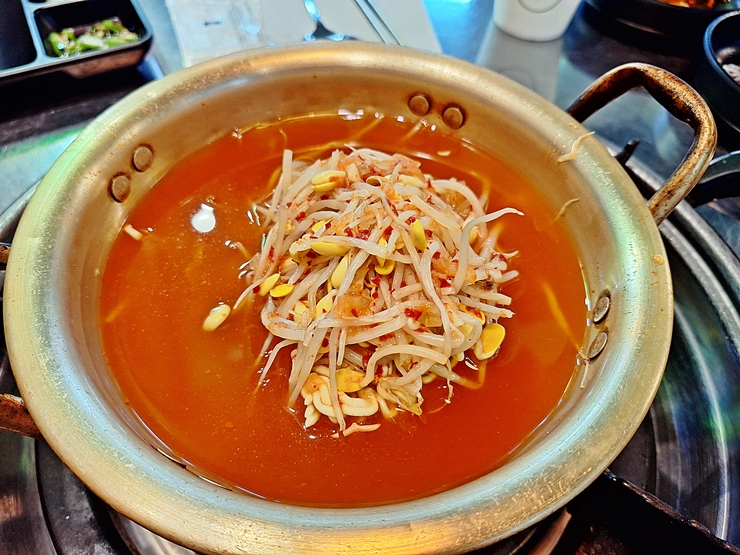 곱창이 나오기 전에 콩나물이 들어간 라면을 준다. 라면은 반 개만 들어 있지만 곱창이 나오기 전 술 안주로 하기 적당하다. 곱창에 집중을 해야 하기 때문에 라면은 먹지 않고 콩나물과 국물만 좀 먹었는데 시원한 맛이 제법 좋았다.