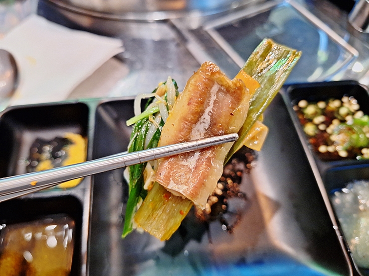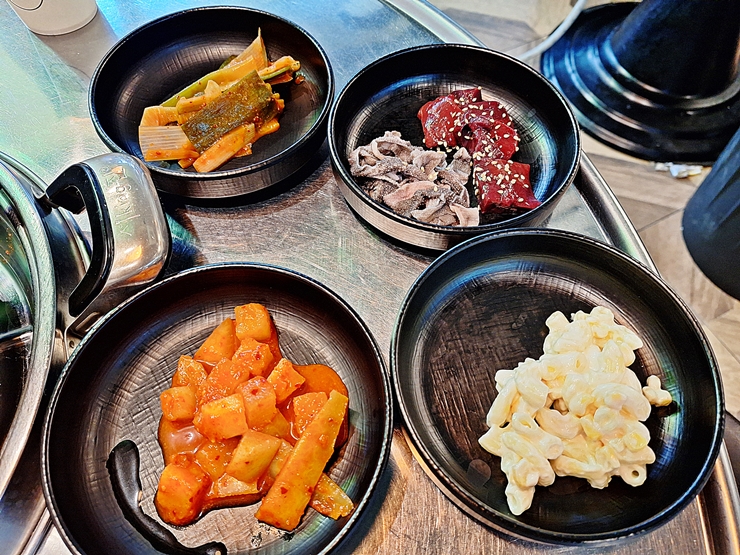 반찬. 파김치, 천엽, 간, 깍두기와 마카로니가 나온다. 간의 경우 생으로 먹으면 기생충에 감염될 가능성이 있기 때문에 구워 먹는 편이 안전하다. 그래서 우리는 간도 잘 구워 먹기로 했지. 역시 건강 관리를 철저히 하는 멋진 나.