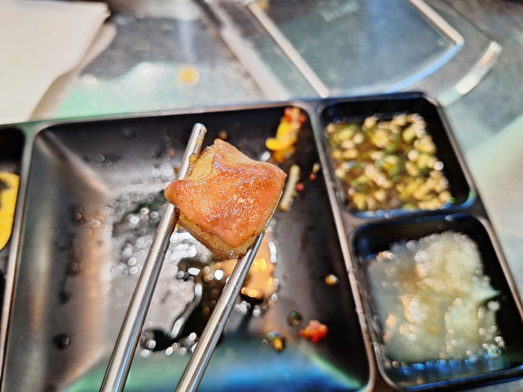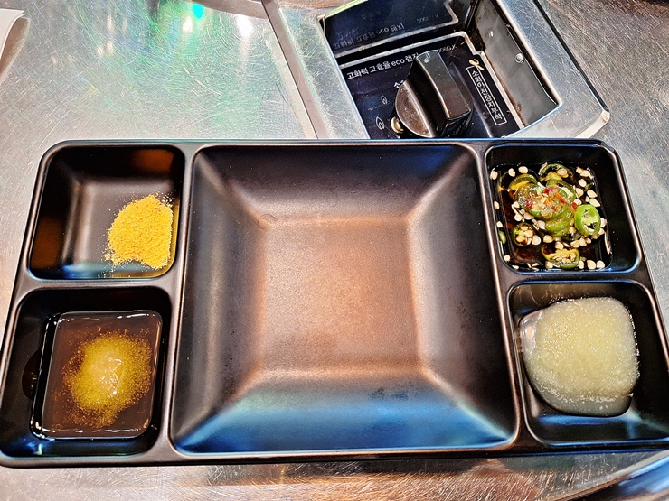 앞 접시에 4종류의 소스가 나온다. 카레 소금, 참기름, 새콤한 간장 소스와 양배추 마늘 소스이다. 소스가 다양하면 맛의 변화를 많이 줄 수 있기 때문에 좋다.