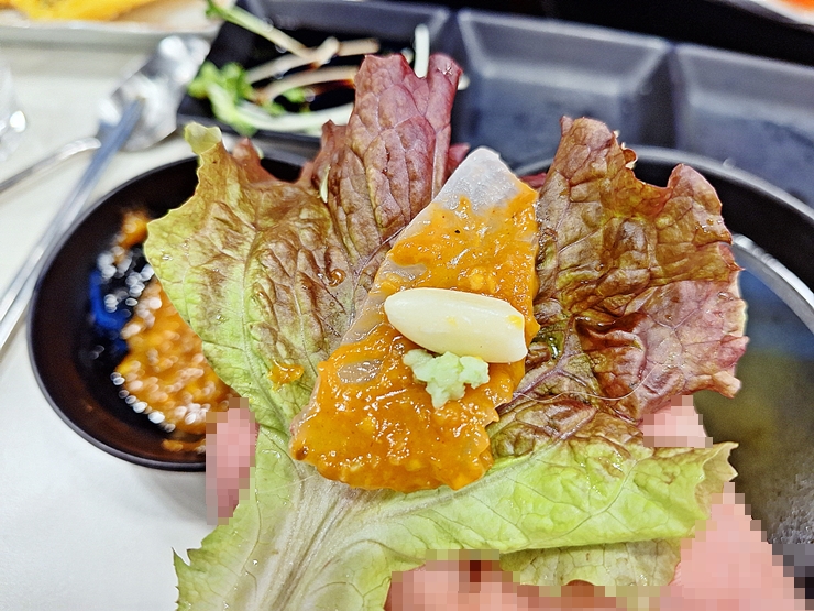 활어 회는 그냥 마음 가는 대로 아무렇게 먹으면 된다. 그래서 나는 간장에 찍어 먹기도 하고 이렇게 쌈을 싸서 먹기도 했지. 오랜만에 짝꿍과 재미나게 회를 먹었다.