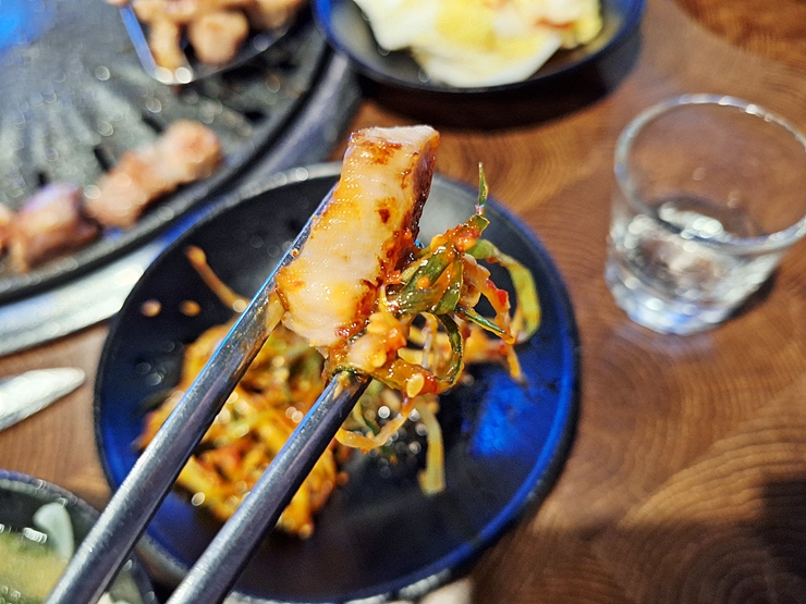 소금을 살짝 찍어 맛있게 냠냠. 역시 고기 퀄리티가 상당히 높은 것을 느낄 수 있다. 항정살 특유의 식감과 더불어 고소하면서 눅진한 맛을 잘 느낄 수 있다. 이런 항정살 한 점에 소주 한 잔을 마시면 이곳이 바로 극락이라 할 수 있겠다.