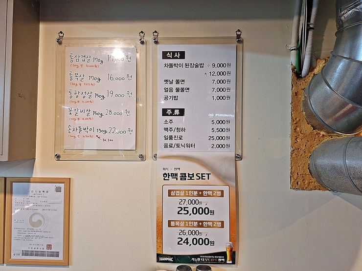 메뉴. 돼지고기와 소고기를 함께 판매하고 있는데, 돼지고기로는 삼겹살, 목살과 항정살이 있고, 소고기로는 꽃갈비와 차돌박이가 있다. 우리는 목살, 항정살과 차돌박이 된장술밥을 주문했다. 그리고 이런 고기를 먹을 때 빠질 수 없는 소주도 주문했지.