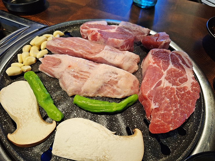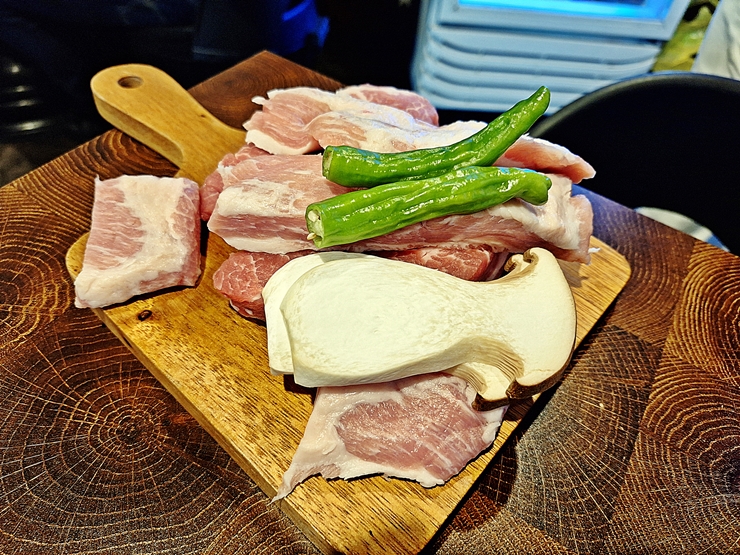아름다운 목살과 항정살의 모습. 고기와 함께 소량의 고추와 버섯이 제공된다. 고기를 먹을 때 다른 것을 먹는 것은 참 좋지 않은 일이지만 가끔 채소도 먹어줘야지.
