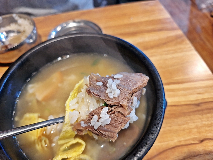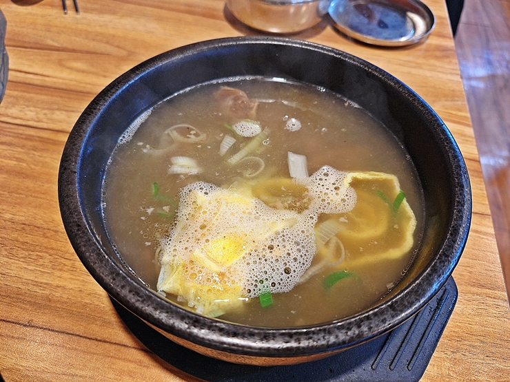짝꿍의 영양갈비탕. 사진에서 잘 보이지는 않지만 갈빗대가 세 대 들어 있었고 수육 같은 고기도 몇 점 들어 있었다. 그 밖에 파와 계란 지단도 들어있다.