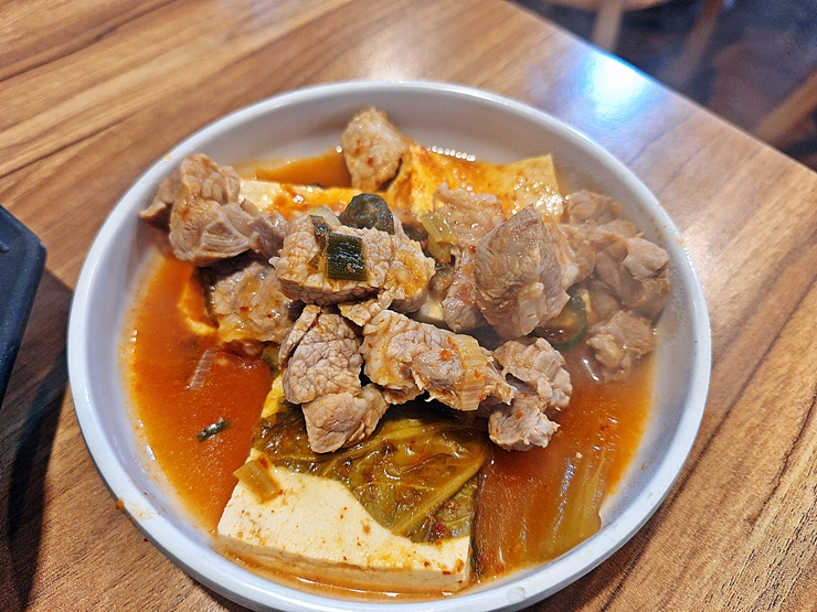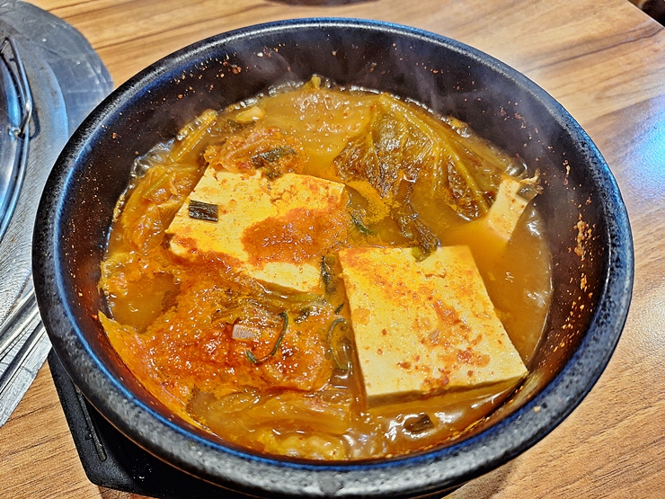 내가 주문한 김치찌개. 큼직한 두부가 세 개 들어 있고 김치, 고기와 파가 들어 있다. 1인분을 주문하면 이렇게 뚝배기로 나오고, 2인분 이상 주문하면 끓여 먹을 수 있도록 버너가 제공 된다고 한다.