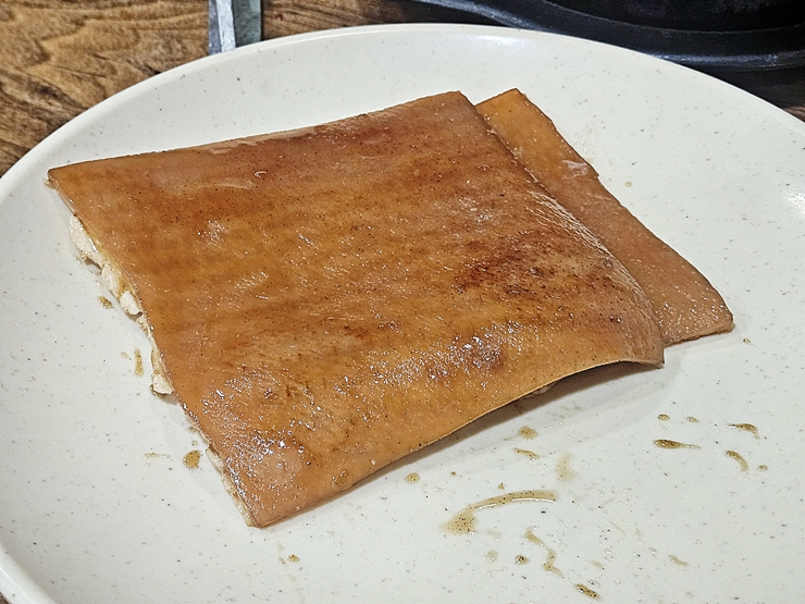 불판 구조로 인해 볶음밥을 주문할 수 없으니 따른 후식 거리인 돼지 껍데기를 주문했다. 돼지 껍데기는 후식으로 먹어도 좋고 간식으로 먹어도 좋고 메인으로 먹어도 좋은 참으로 좋은 부위가 아닐 수 없다.