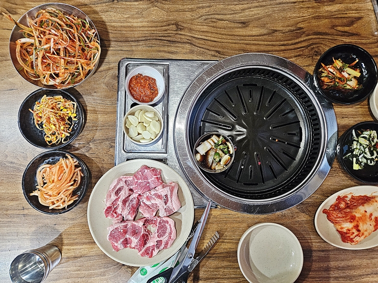 일일이 다 올리기 귀찮으니 항공 샷을 올리도록 한다. 반찬으로는 파절이, 콩나물, 무생채, 김치, 쌈장과 마늘 등이 나온다. 이 중에 콩나물, 무생채와 파절이는 그냥 먹어도 되고 불판에 구워 먹어도 된다. 난 그냥 먹는 것을 좀 더 좋아하지만 불판에 구워 먹는 것도 나쁘지 않기 때문에 이번에는 얌전하게 구워 먹기로 했지.
