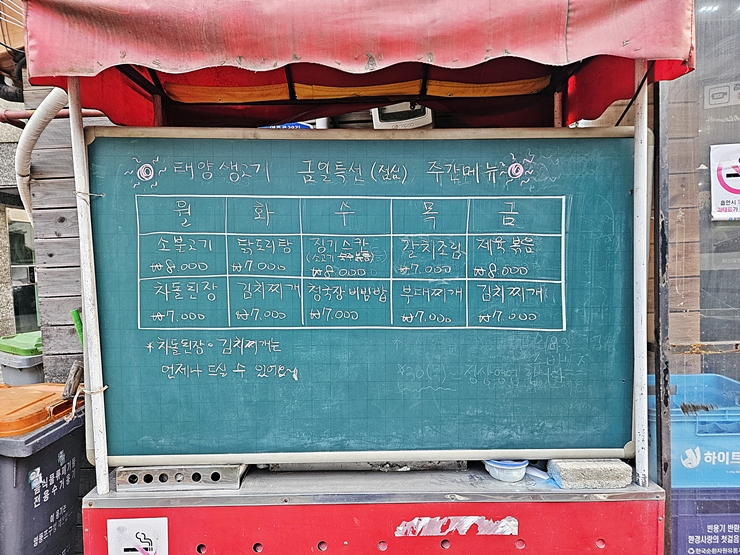 매장 바깥에는 주간 점심 특선 메뉴가 적혀있다. 소불고기부터 김치찌개까지 상당히 다양한 점심 요리를 판매한다. 하지만 우리는 점심이더라도 고기를 먹어야지. 고기는 낮에 먹어도 맛있고 밤에 먹어도 맛있고 아침에 먹어도 맛있는 참으로 좋은 것이다.