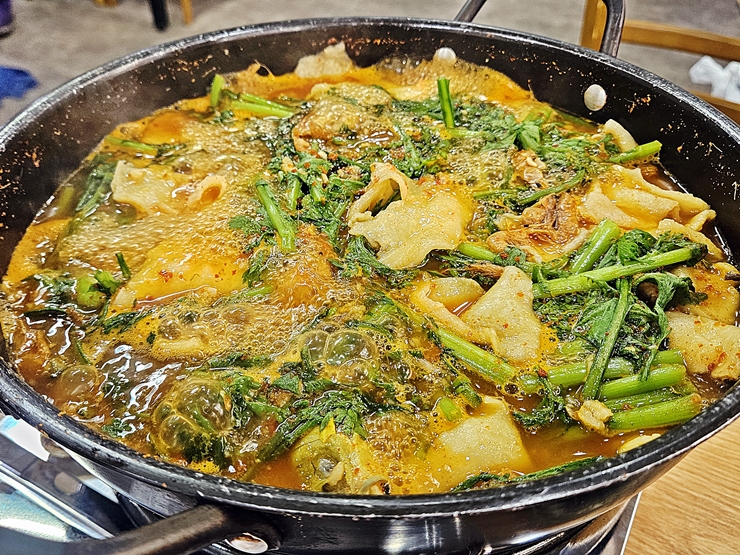 아름다운 모습의 쏘가리 매운탕. 쏘가리와 함께 수제비, 미나리와 파 등이 한가득 들어 있다. 한소끔 팔팔 끓여 먹으면 쏘가리 매운탕의 진면목을 느낄 수 있다. 그래서 조금 시간이 걸리더라도 한 번 팔팔 끓인 후 먹기로 했다.