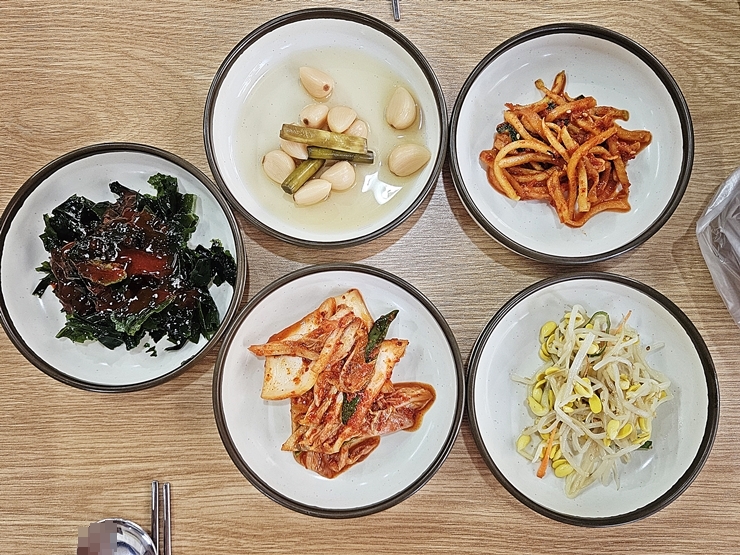 반찬. 다시마 초무침, 마늘 장아찌, 무생채, 김치와 콩나물이 나온다. 특색 있는 반찬은 아니고 소박하지만 맛에서 정성이 느껴진다.