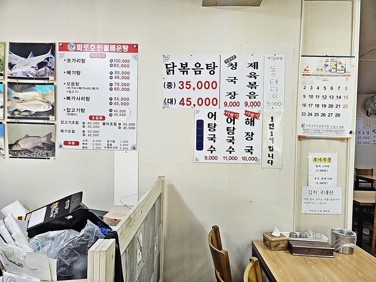 메뉴. 쏘가리탕, 메기탕, 모둠, 빠가사리탕과 잡고기탕을 판매하고 있고 조림으로는 잡고기 조림, 메기 조림을 판매한다. 그 밖에 닭볶음탕, 청국장, 제육볶음, 동태탕, 어탕국수, 다슬기 어탕국수와 다슬기 해장국을 판매한다. 아무래도 민물 매운탕은 호불호가 있기 때문에 대체할 수 있는 메뉴를 갖춘 것 같다.