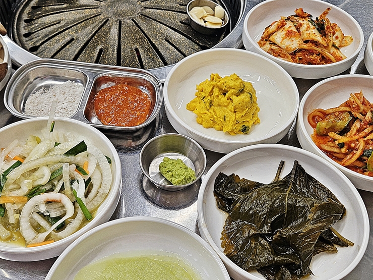 반찬. 김치, 소금, 쌈장, 호박 샐러드, 와사비, 무생채, 깻잎 장아찌, 쌈무와 양파 절임이 나온다. 고기 반찬이 없지만 괜찮다. 고기를 먹으러 왔기 때문이다. 평소 같았으면 이런 반찬을 안주 삼아 소주 한 잔을 기울였겠지만 컨디션이 좋지 않았기 때문에 술은 고기가 나올 때 먹기로 했다.