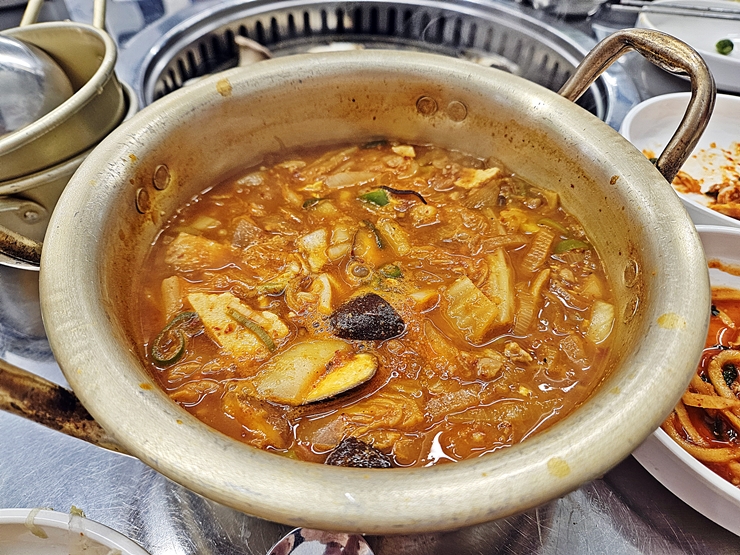 고기와 술을 마시는데 된장찌개가 빠질 수 없지. 그래서 된장찌개도 하나 주문했다. 소량의 고기, 버섯, 두부, 양파와 파가 아낌 없이 들어간 된장찌개다. 처음 나올 때 비주얼에 상당히 놀랐는데, 여느 다른 고깃집과 다르게 된장찌개의 색이 굉장히 진하고 냄새가 구수했기 때문이다.