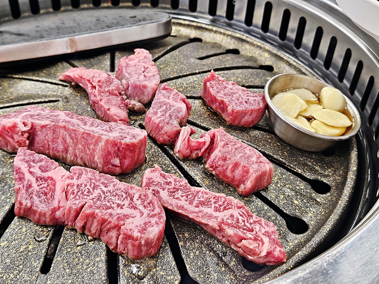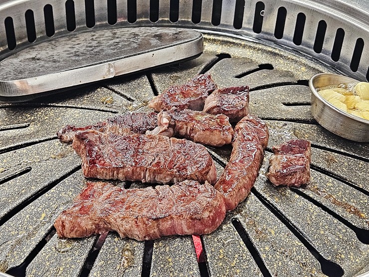 정석을 따르자면 안창살을 먼저 구운 후 꽃살을 구워야 하겠지만 그냥 둘 다 섞어 먹기로 하고 적당한 양을 불판에 올렸다. 소고기는 웰던으로 구울 경우 그 맛이 많이 사라지기 때문에, 돼지고기나 닭고기에 비해 적당히 구워 먹어야 한다. 고기를 굽는 것은 언제나 나의 몫이지.