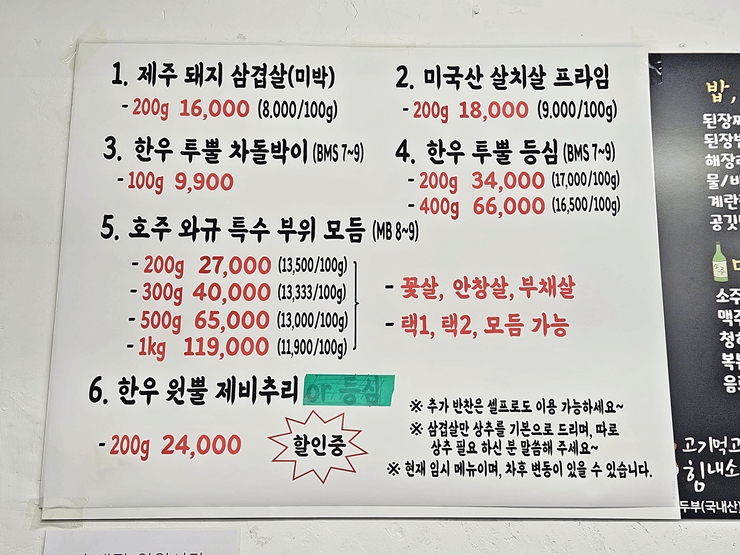메뉴. 제주 돼지 삼겹살, 미국 소고기 살치살, 한우 투뿔 차돌박이, 한우 투뿔 등심, 호주 와규 특수 부위와 한우 원뿔 제비추리를 판매하고 있다. 현재는 임시 메뉴이며 차후 변동이 있을 수 있다고 하는데, 이런 것은 개선이 필요하다. 굳이 한우, 미국 소, 호주 와규를 나누지 않고 하나로 통일하면 더욱 경쟁력이 있겠다. 우리는 호주 와규 특수 부위 중에 꽃살과 안창살을 선택하고 주문했다.