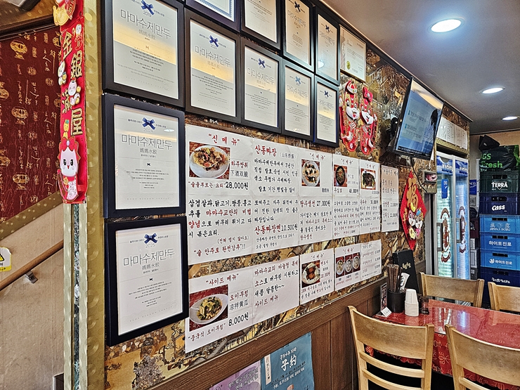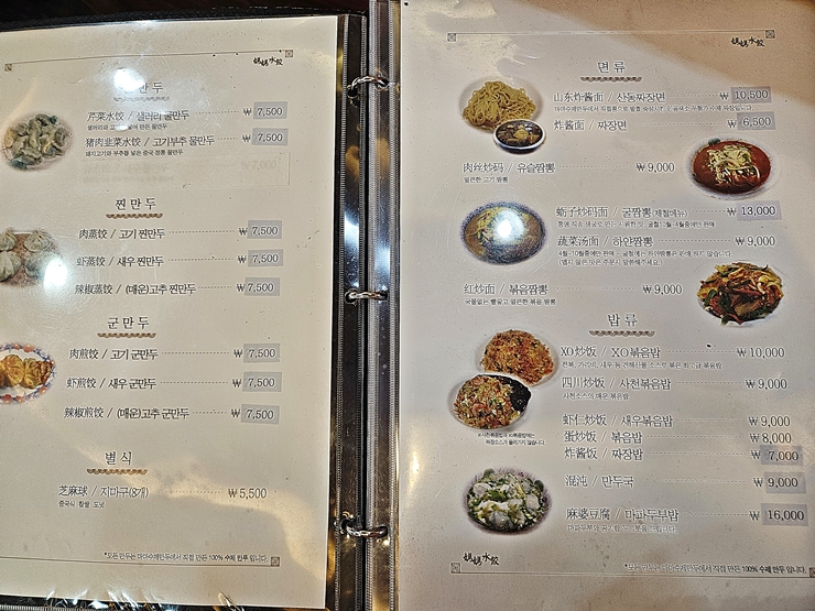 메뉴. 수 많은 만두와 함께 짜장면, 짬뽕, 볶음밥과 그 밖의 중국 요리도 판매하고 있다. 사진에 찍히지 않았지만 내가 좋아하는 가지 고기 튀김도 있었다. 그래서 다양한 요리를 먹어보기 위해 벨트를 한 칸 풀은 후 전채 요리, 만두 4종류, 굴짬뽕과 가지 고기 튀김도 주문했다. 당연히 혼자 먹을 수 있는 양은 아니고 지인을 꼬드겨서 함께 가서 먹었다.