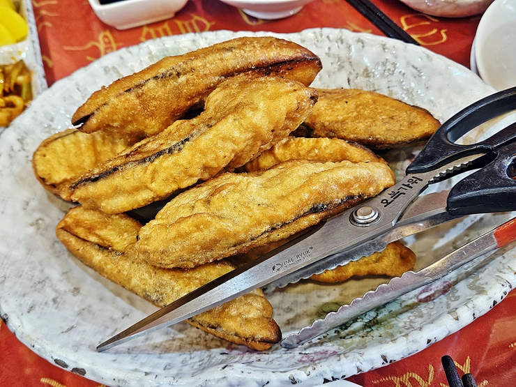 이 날의 백미였던 가지 고기 튀김. 가지 안에 고기를 한 가득 넣어 튀긴 것이다. 가지를 만두피처럼 사용했다고 생각하면 된다. 가지 고기 튀김을 이대로 먹어도 좋지만 입 안에 화상을 입을 가능성이 커지기 때문에 반 정도 잘라 먹었다. 고기의 풍미가 기름을 잔뜩 머금은 가지와 상당히 잘 어울린다. 참으로 잘 만든 튀김이었다. 새절역 근처에서 맛있는 만두와 가지 고기 튀김을 먹고 싶다면 꼭 한 번 가볼 것을 추천하는 곳이다.