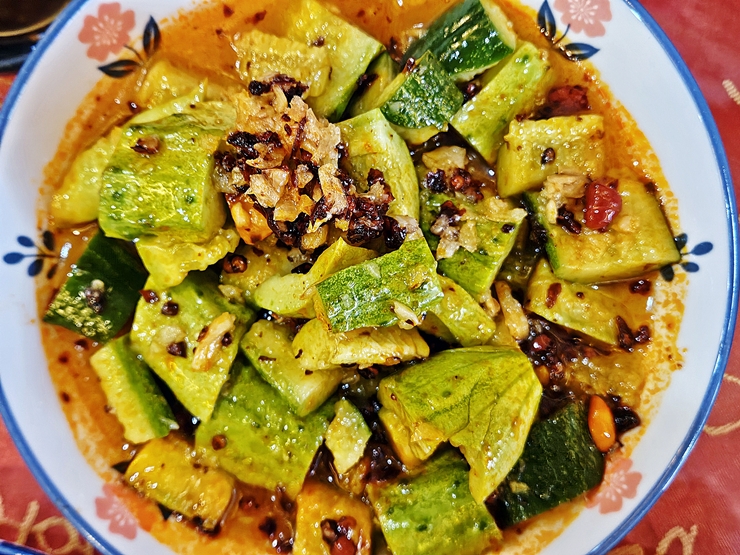 전채 요리인 파이황과. 파이황과는 흔히 오이 탕탕이라고도 하는데 오이를 칼로 세게 내려친 후 양념을 끼얹어 먹는 음식이다. 내가 참으로 좋아하는 요리 중의 하다. 굉장히 만들기 쉽지만 맛은 절대 가볍지 않다. 가게마다 양념의 맛이 다 달라서 그 가게의 개성을 느낄 수 있는 요리이기도 하다. 마마수제만두의 파이황과는 고추기름을 둘러 제공하는데 고추기름의 맛이 오이와 잘 어울린다.