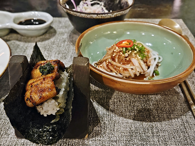 장어 마끼와 국수. 장어의 느끼함을 잡기 위해 장어 밑에 묵은지를 넣었다. 묵은지의 상큼함이 장어의 느끼함을 잘 잡아준다. 국수는 비빔국수로 나오는데 입 안에 남아있는 장어의 느끼함을 시원하게 날려준다.