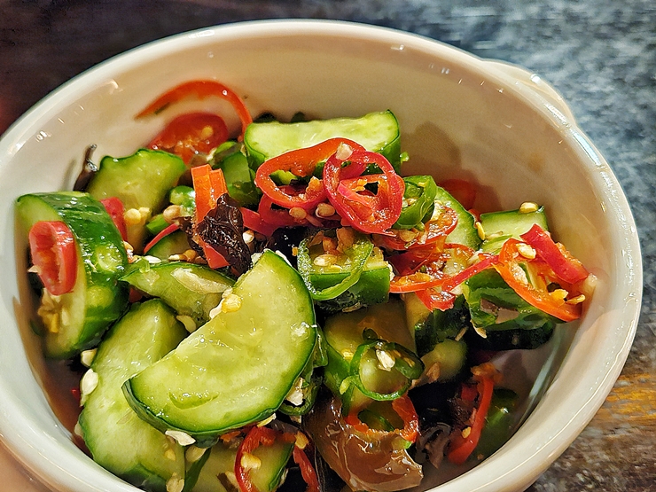 내가 참으로 좋아하는 파이황과. 오이, 고추와 목이버섯을 넣어 만들었다. 참으로 만들기 간단한 요리이지만 중독성이 이상할 만큼 강하다. 파이황과의 새콤한 맛은 메인 요리를 먹기 전에 위에 활기를 불어 넣고 식욕을 돋우는 역할을 한다.