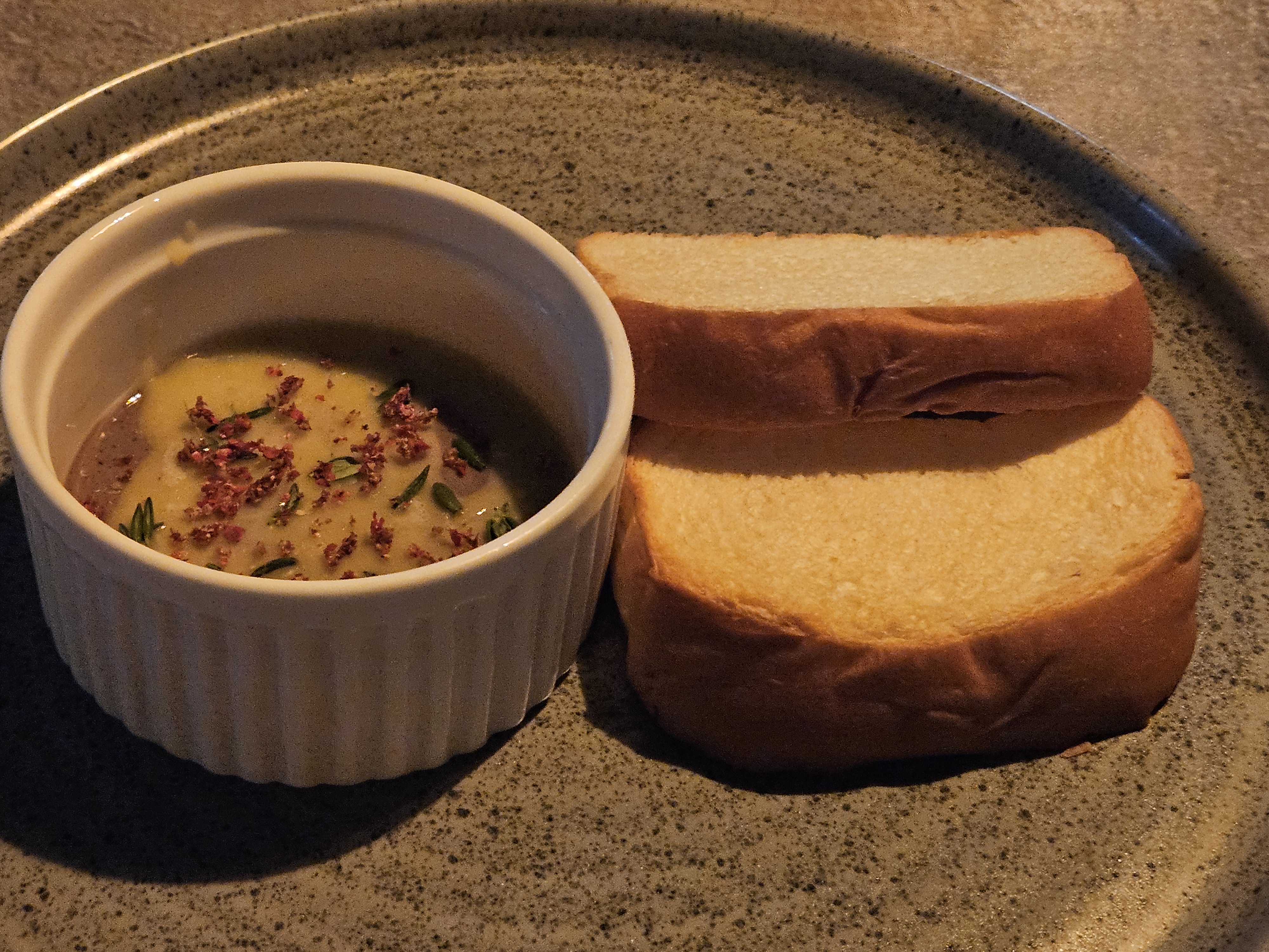 브리오슈와 닭 간 빠테. 빠테를 브리오슈에 발라 먹으면 된다. 브리오슈는 기성품을 사용하는 것 같지 않았다. 따뜻하게 구워 나온 브리오슈와 닭 간의 빠테가 상당히 잘 어울렸다. 닭 간의 경우 푸아그라만큼은 아니지만 상당히 고소하고 눅진한 맛이 나는 것이 특징이다. 담백한 브리오슈와 눅진한 닭 간 빠테가 만나니 참으로 좋은 조합이었다.