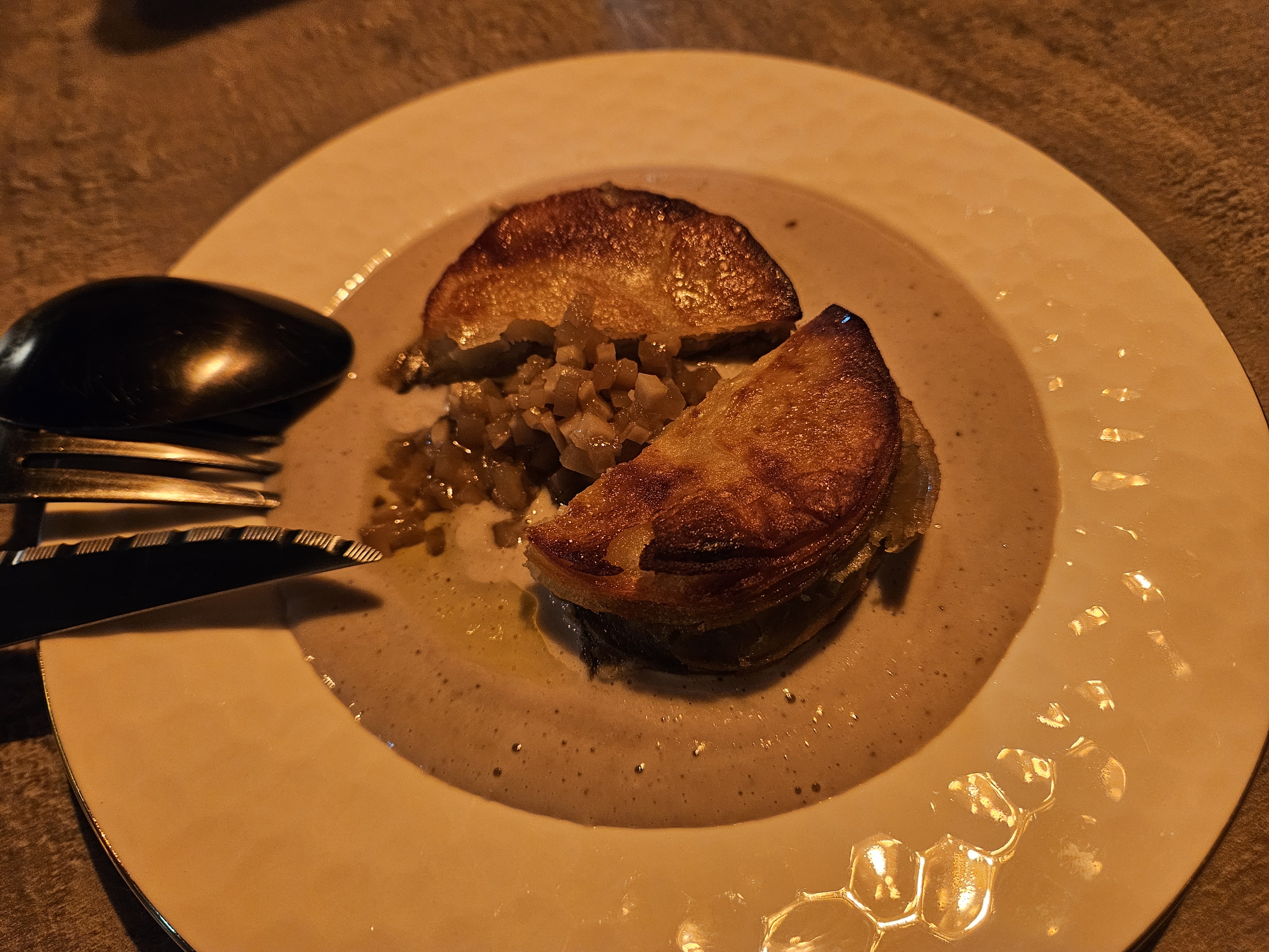 도피누아즈. 프랑스식 감자 그라탕이라고 한다. 감자를 크레이프처럼 겹겹이 쌓아 만든 것이 인상적이었다. 감자는 그냥 구워 먹어도 맛있고 삶아 먹어도 맛있고 튀겨 먹어도 맛있는 실로 좋은 재료다. 이런 감자를 훌륭한 조리 기술로 만들면 맛이 없을 수가 없지.