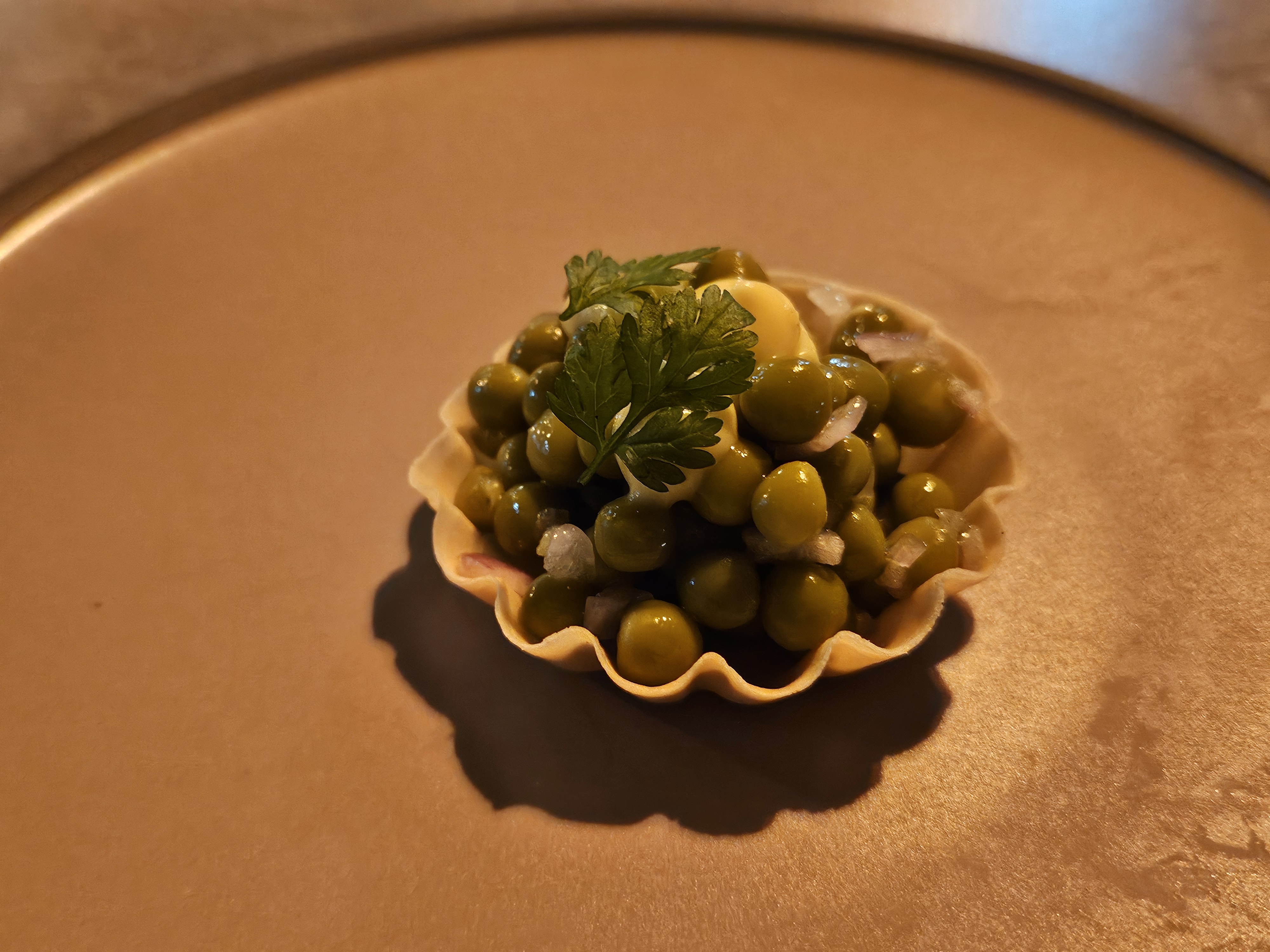 완두콩. 완두콩이 어떻게 나올까 궁금했다. 설마 에다마메처럼 나오지 않을까 약간 우려가 있었는데 완두콩을 예쁘게 타르트를 만들어 제공한다. 완두콩에서는 풋내가 전혀 느껴지지 않았고 은은한 단 맛이 느껴진다. 난 달거나 신 음식을 잘 먹지 못 하는데, 나에게 딱 좋은 달달함이었다.