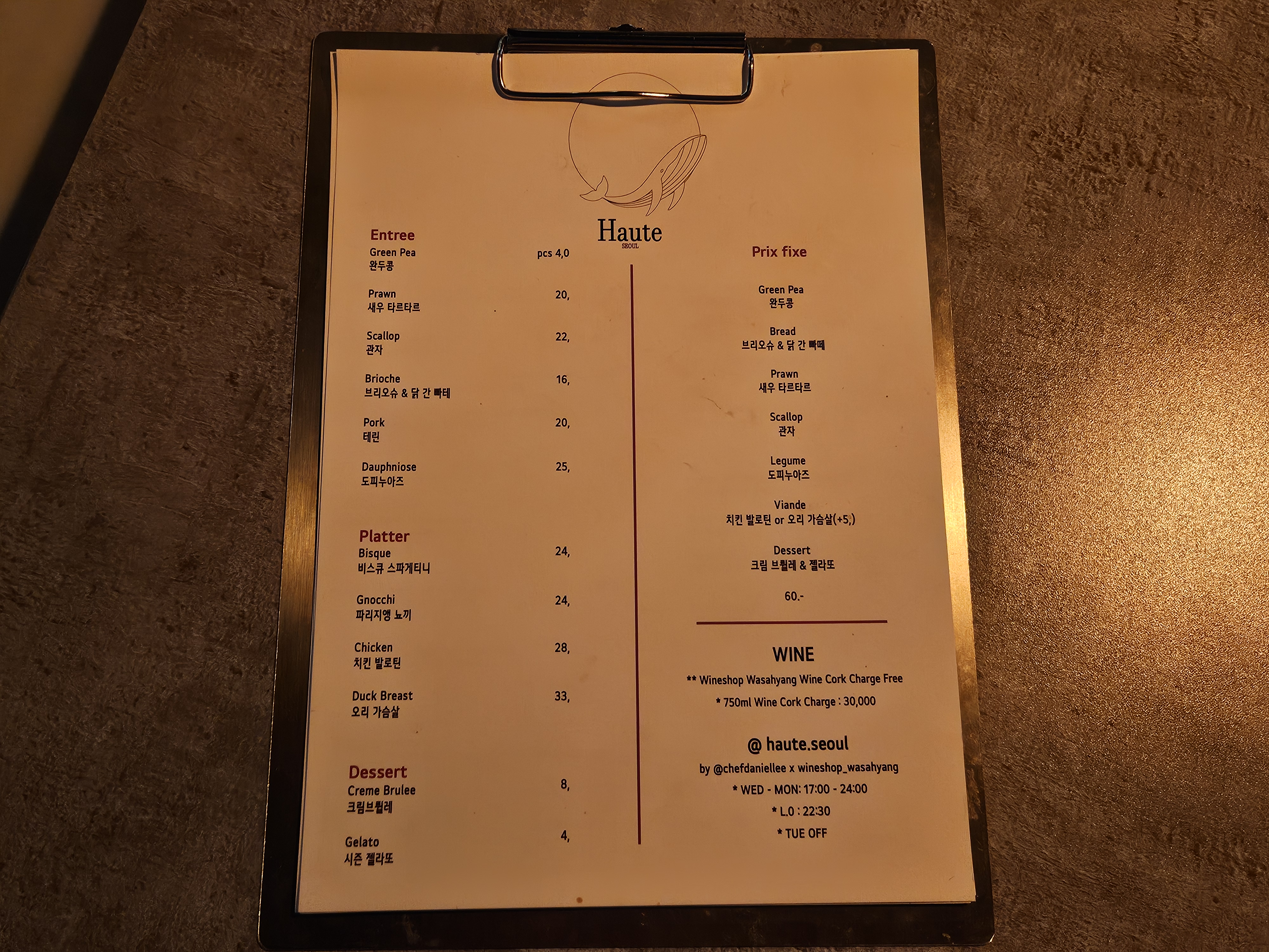 지인의 생일 파티가 있어서 방문한 오뜨서울. 오뜨가 무슨 뜻인지 잠깐 궁금했는데 어련한 뜻이 있겠지 싶어서 찾아보지 않았다. 망원역에서 쉽게 찾아갈 수 있어서 퇴근하면서 술술 넘어갔지. 나의 생일이었더라면 고기를 푸짐하게 구워 먹으며 소주 한 잔을 했겠지만 지인의 생일 파티니 축하한다는 말을 건네고 참석했다.
