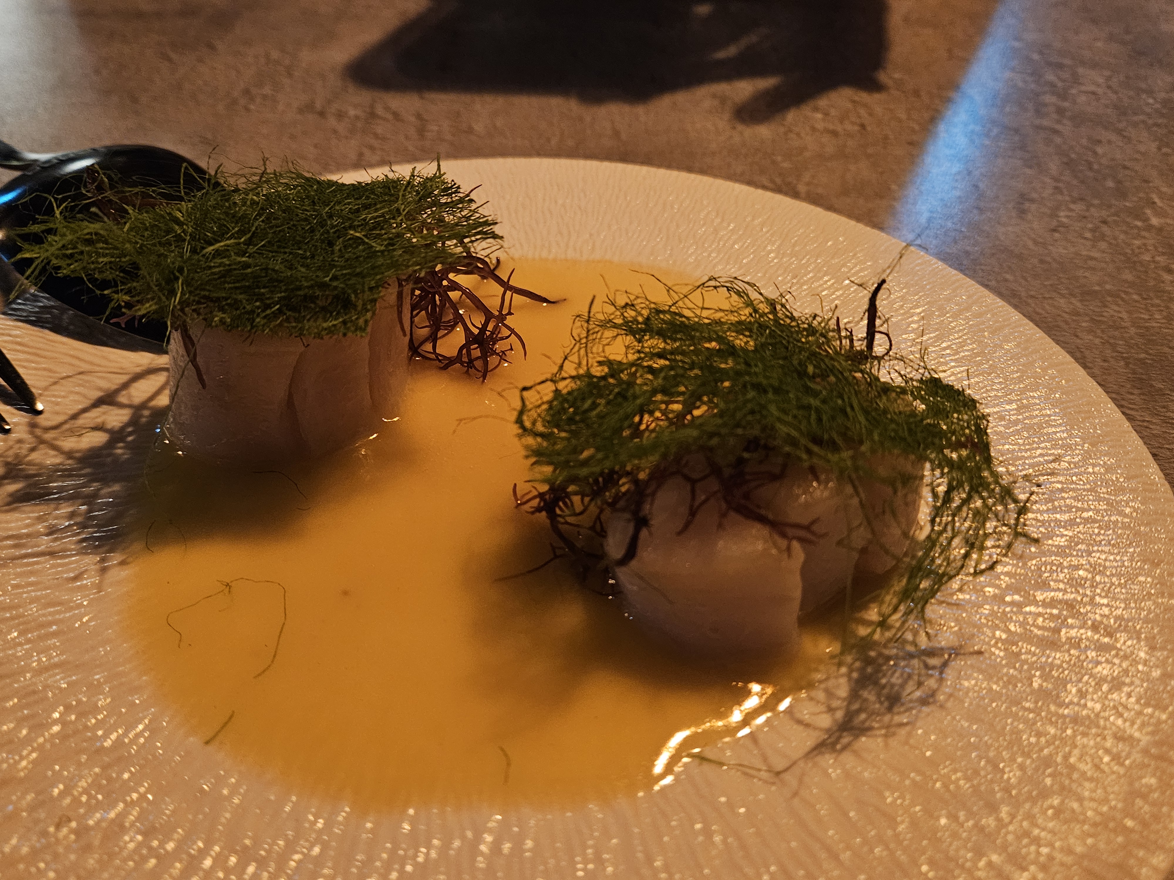 관자. 부드럽게 잘 조리한 관자는 전혀 즐기지 않고 관자 특유의 풍미를 잘 느낄 수 있었다. 왜 내가 관자를 요리하면 이런 맛이 나지 않는 것일까. 관자는 의외로 요리하기 어려운 재료라서 잘못 조리할 경우 굉장히 질기게 조리가 되거나, 관자의 맛을 느낄 수 없을 정도로 뻣뻣하게 되는 경우가 있다. 이 정도로 관자를 잘 요리하는 것이 상당히 놀라웠다.