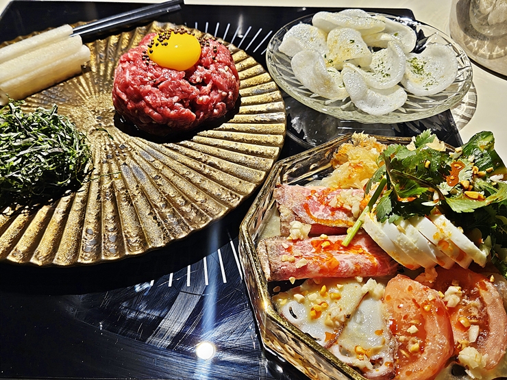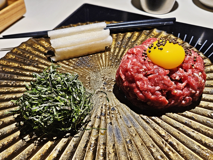 육회. 육회 위에 노른자를 올리고 사이드로 채 썬 깻잎과 배를 제공한다. 개인적으로 육회에 노른자를 섞어 먹는 것을 그다지 좋아하지 않지만, 식당에서 주는 대로 먹는 것이 좋지. 야무지게 비빈 후 맛있게 먹었다. 육회는 적당히 기름지면서 탄력이 있어서 씹는 맛이 좋았다.