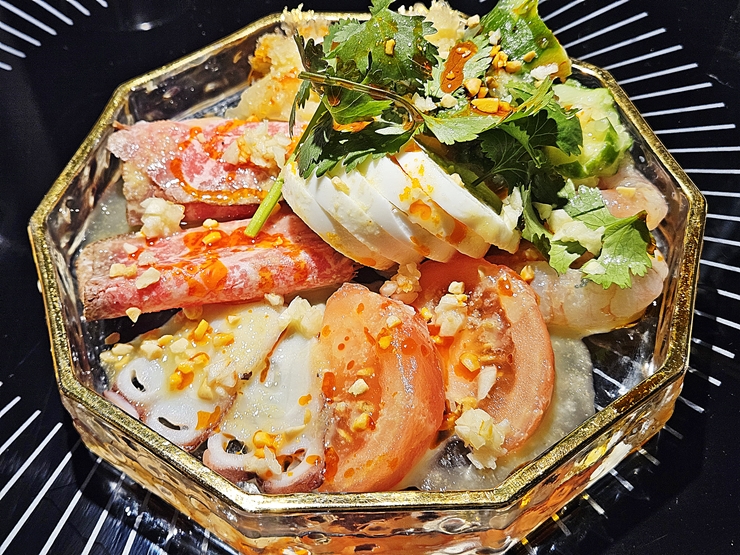 샐러드. 토마토, 문어, 햄, 계란, 해파리, 새우, 오이와 고수가 올라간다. 내가 좋아하는 것들이 한가득 올라간 아름다운 샐러드다. 이런 샐러드라면 끊임 없이 먹을 수 있지. 하지만 샐러드를 끊임 없이 먹다가 다음 것을 먹지 못하는 불상사가 생기기 때문에 적당히 먹었다.