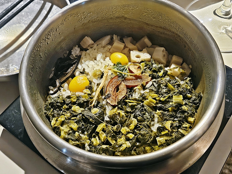 곤드레밥. 연근, 은행, 버섯, 대추와 곤드레가 들어있다. 함께 나온 양념장을 넣어 비벼서 먹으면 된다. 몇 년 전에 곤드레밥이 한참 유행을 했는데 어느 순간부터 많이 보이지 않게 되었다. 그런 곤드레밥을 오랜만에 접하니 옛날 기억도 나고 좋았다.