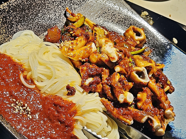 낙지 볶음과 소면. 딱 봐도 매워 보여서 사진을 찍은 후 조금 먹어봤는데 아니나 다를까 내 입에는 정말 매웠다. 그래서 많이 먹지 못했지. 광화문에서 다양하고 맛있는 보양식을 풍성하게 먹고 싶을 때 찾아가면 좋은 곳이다.